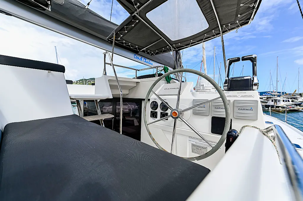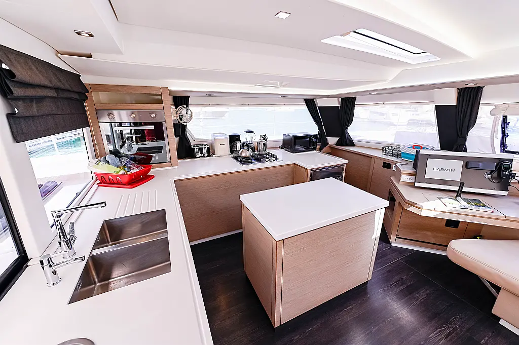 The hulls have a fine entry for speed, while fixed keels help her point to weather. Sailing is simplified with 1 electric winch, a foot switch for the windlass, and dual chart plotters & radar (one at the helm and one at the nav station). The helm features a double seat with all controls within easy reach. Winches are set forward, so sail handling never gets in the helmsman’s way. And if you’re sailing short-handed, the autopilot is your best mate.