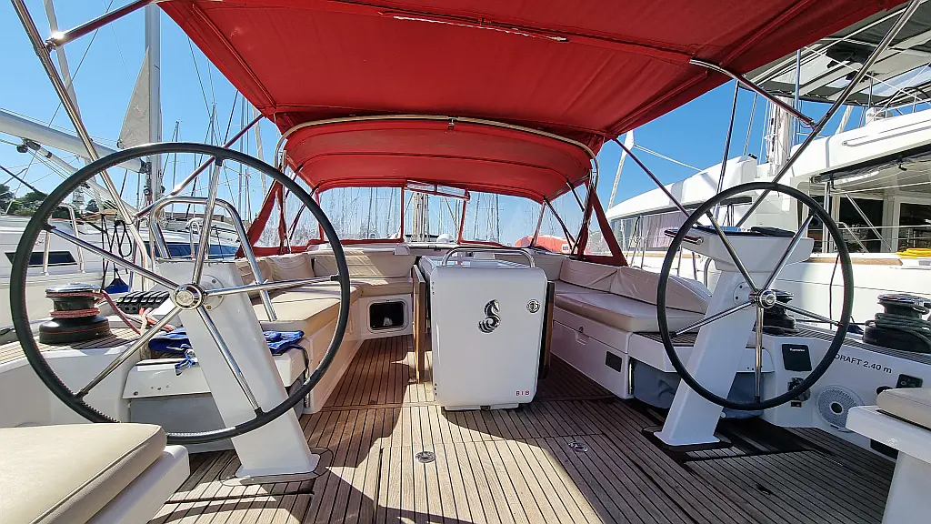 Ice maker , Refrigerator , Bimini , Sprayhood , Outboard engine , Electric winches , Coffee maker , Generator , Electric toilet , Teak Cockpit , Air condition , Heating , Cockpit cushions
