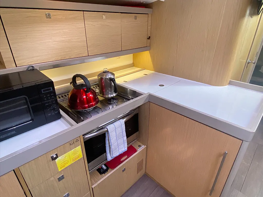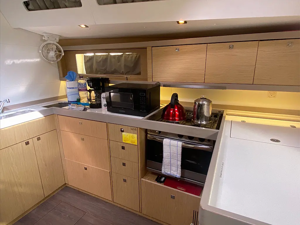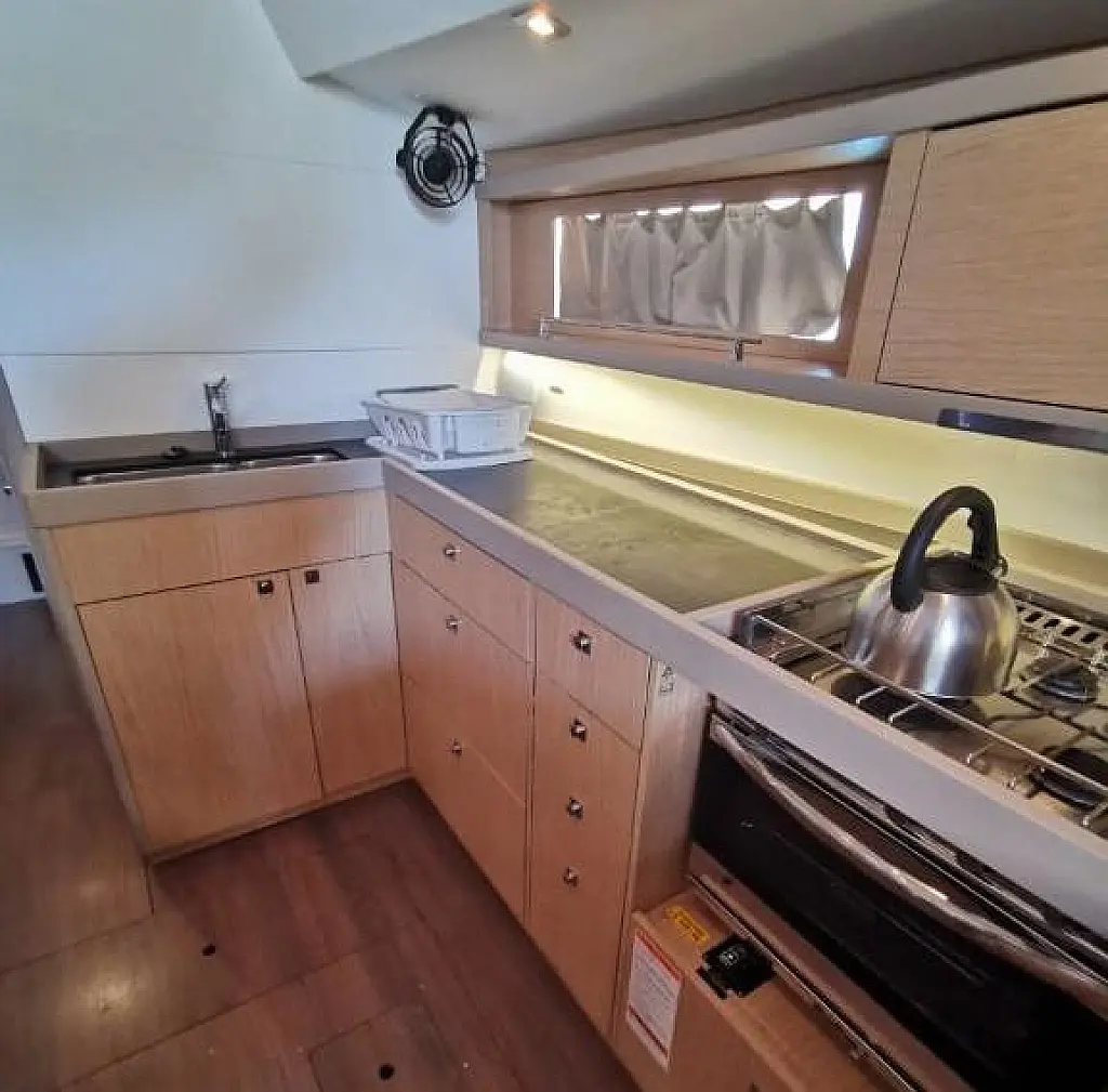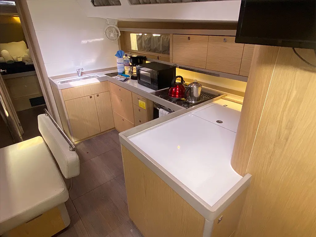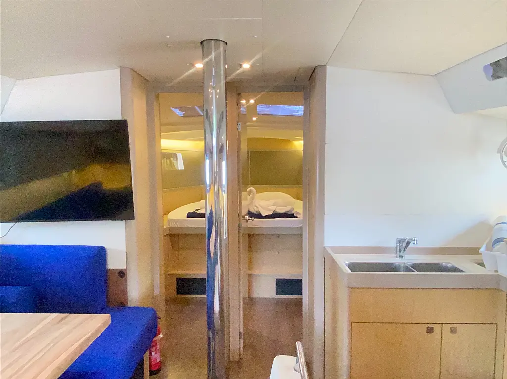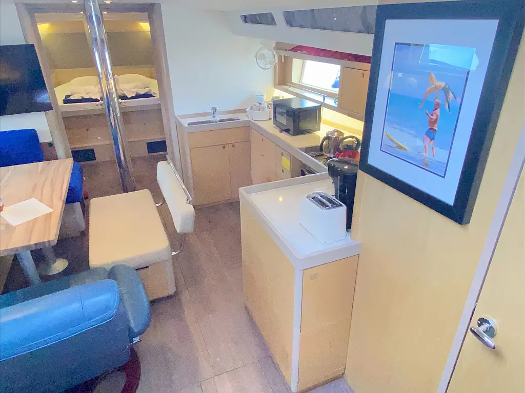 The rest of the boat remains the same. he forward bulkhead holds a 42' flat screen smart tv. The well-appointed galley with everything you need for dining at sea—from a two burner gas cooker to a refrigerator, sink and storage for included cookware. Light taupe cushions are complimented by contemporary oak-colored woodwork amplifying the ambiance of this stylish yacht.