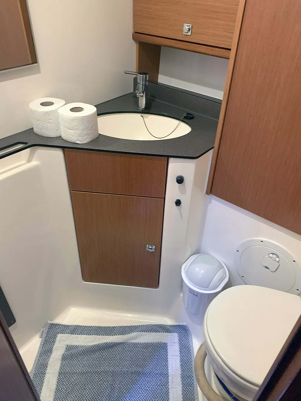 Sprayhood , Bimini , Cockpit speakers , Holding tank , Refrigerator , Swimming platform , Cockpit cushions , Electric toilet