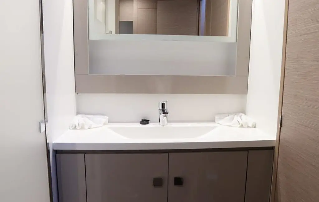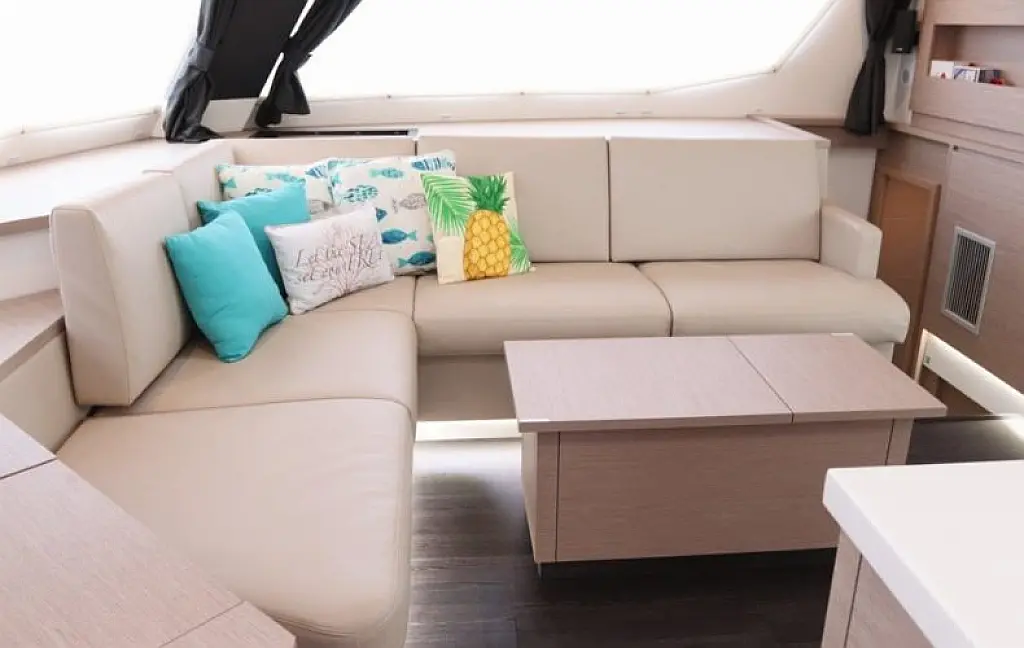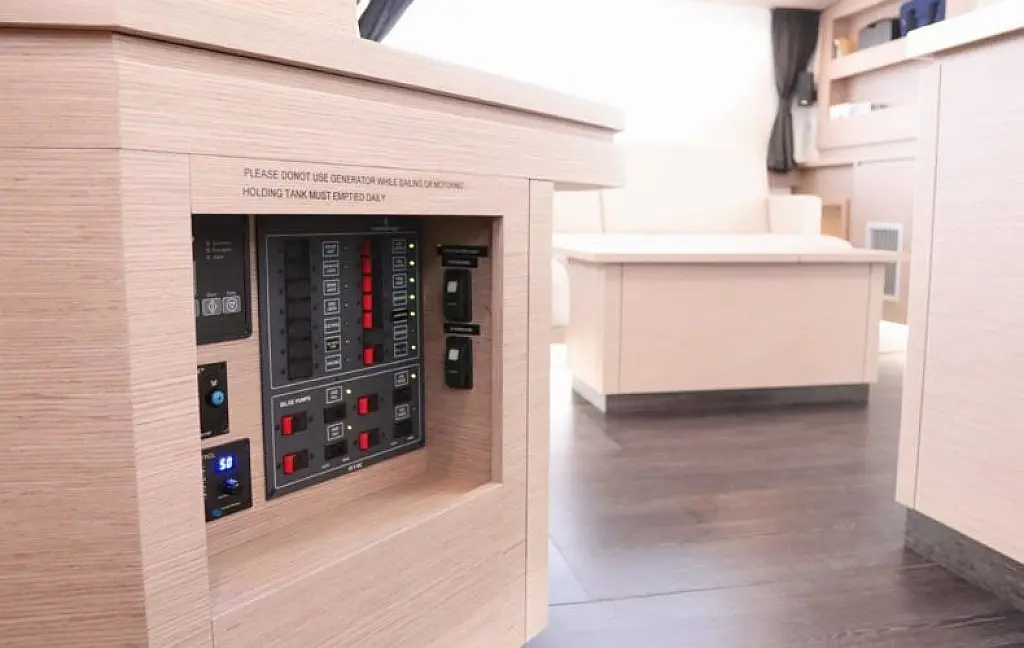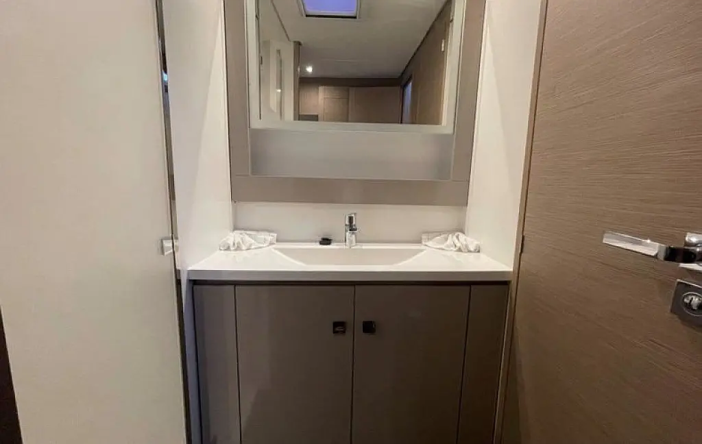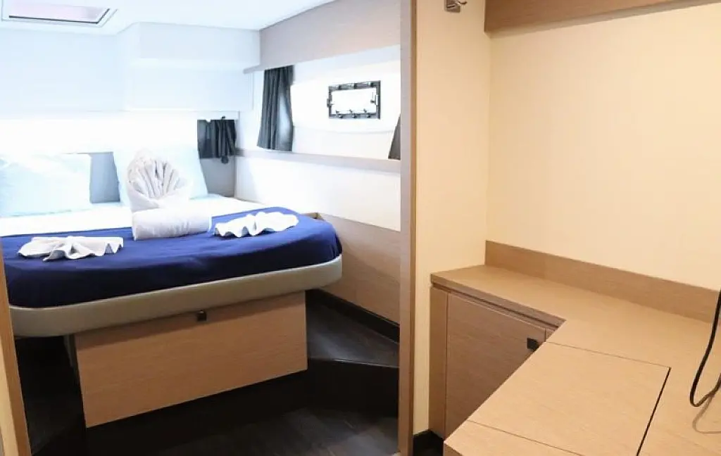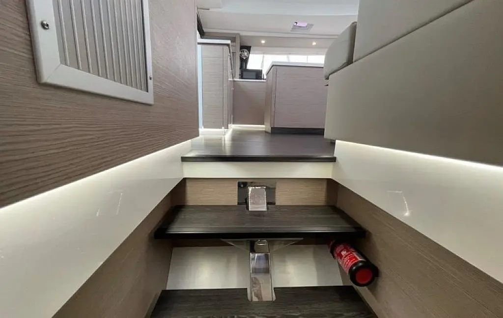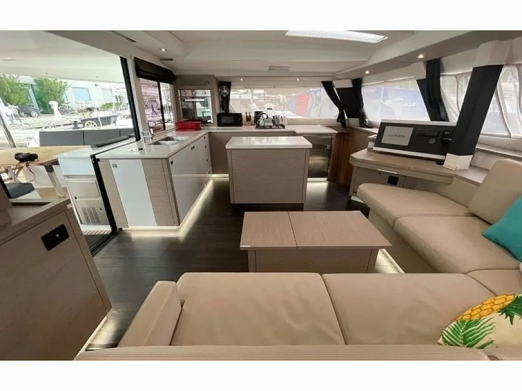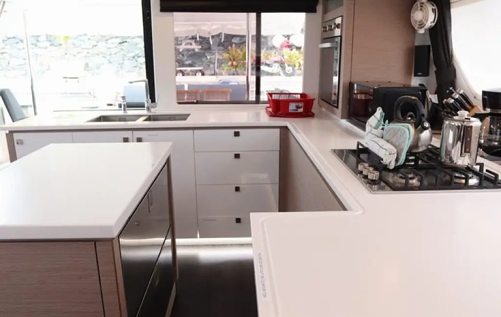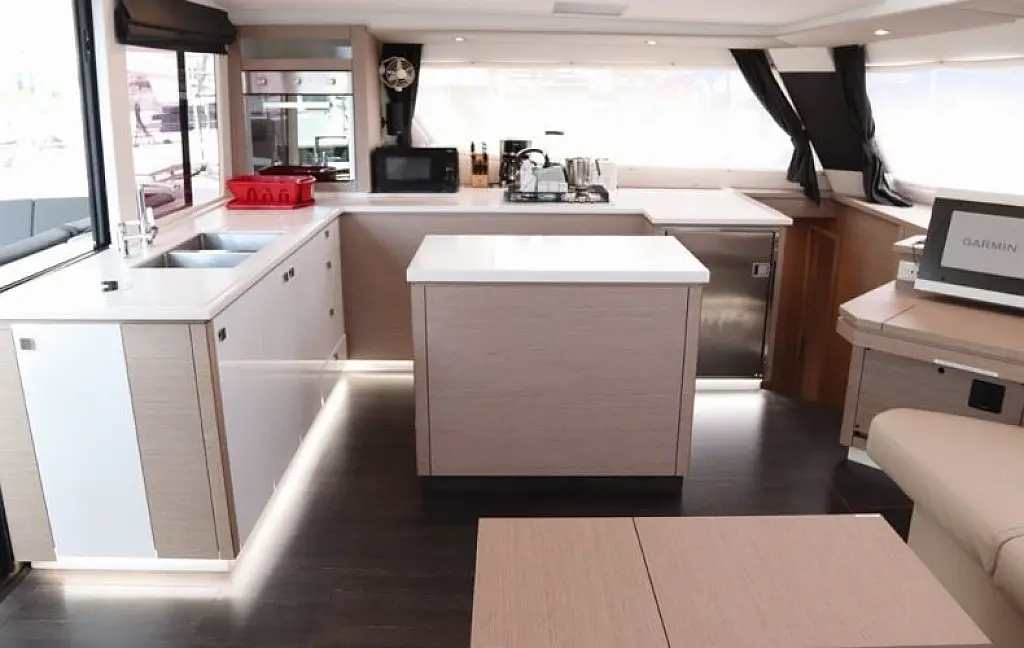 The hulls have a fine entry for speed, while fixed keels help her point to weather. Sailing is simplified with 1 electric winch, a foot switch for the windlass, and dual chart plotters & radar (one at the helm and one at the nav station). The helm features a double seat with all controls within easy reach. Winches are set forward, so sail handling never gets in the helmsman’s way. And if you’re sailing short-handed, the autopilot is your best mate.