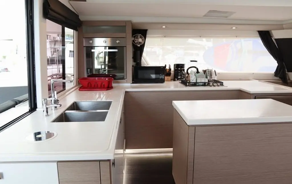 The galley rivals any home kitchen, with a large double-drawer stainless fridge, extra fridge and cockpit fridge, 4-burner stove, counter-level oven, and a microwave. A central island lets multiple chefs join in, and the pass-through sliding window makes serving straight to the cockpit a breeze.