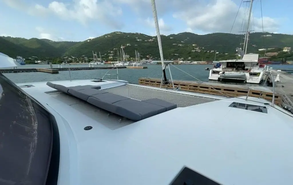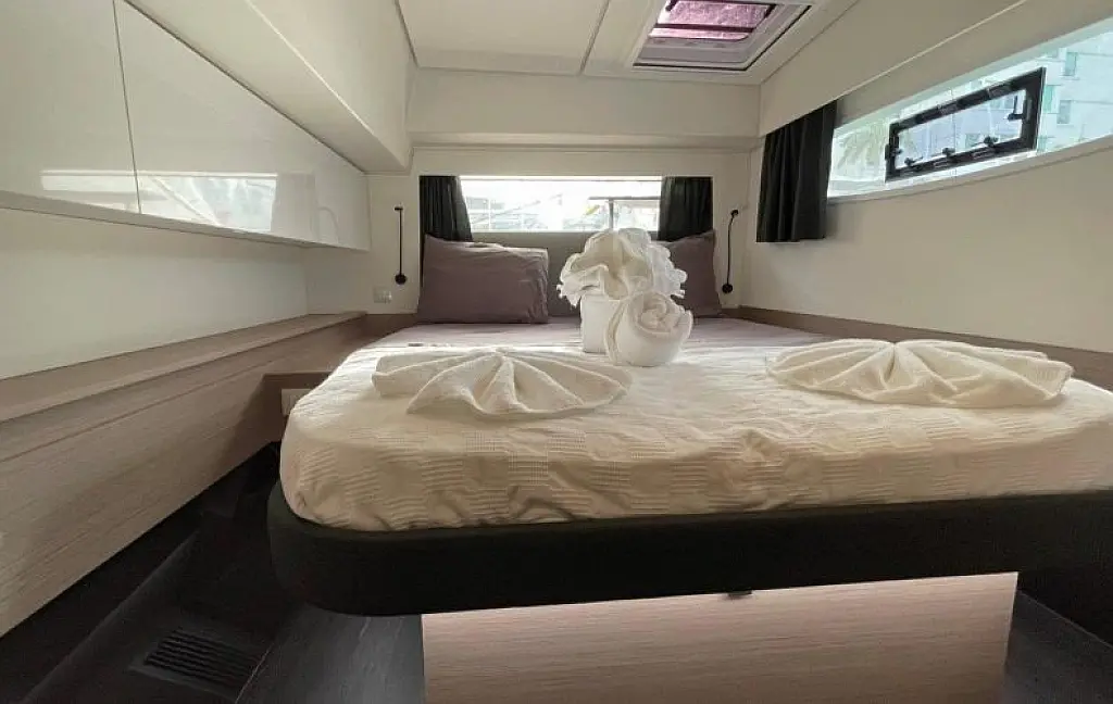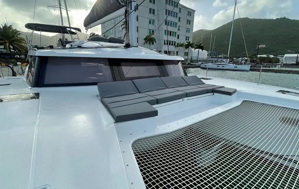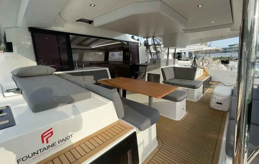 Down below each hull is the mirror of the other. Both laid out with double guest cabins fore and aft, each with its own en-suite head and separate shower. The Salon is a bright and roomy place to spend time. A large sliding door aft lets living space spill into the cockpit, where a dining table and ample relaxation stations are located. Indoors, visibility in all directions is excellent, thanks to oversize windows; the center one forward opens outward to let in the breeze. The skylights overhead provide a clear view of the sails, and there is a low coffee table close by. Above Decks The Elba 45 boasts an impressive range of outdoor space, with the emphasis on eating in the cockpit and lounging either there, on the flybridge or on the foredeck sun pads. The deep cockpit offers sofas and a sunbed so you can choose where and how to conduct your afternoon siesta.