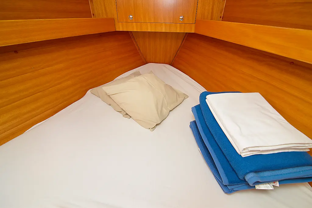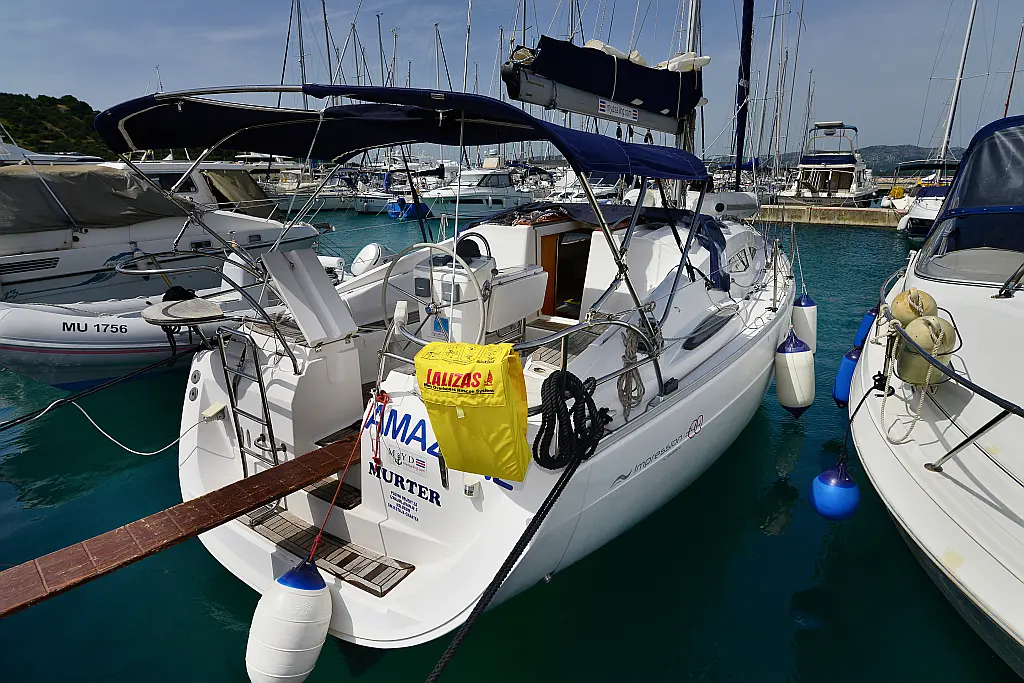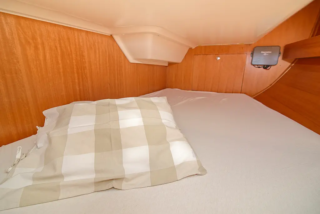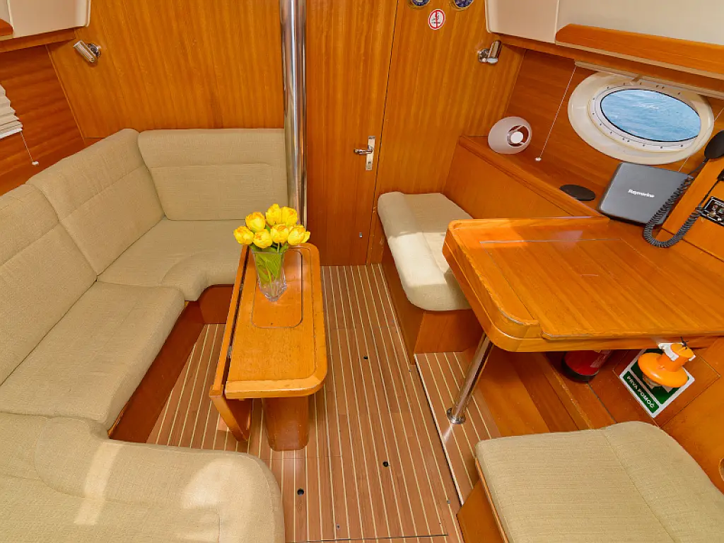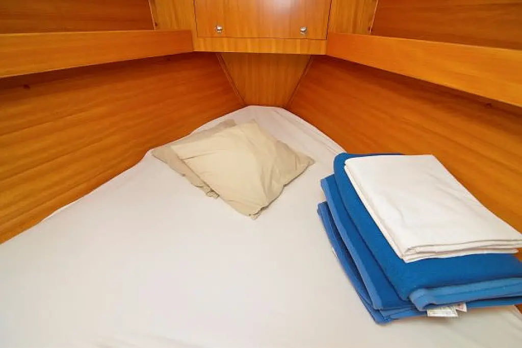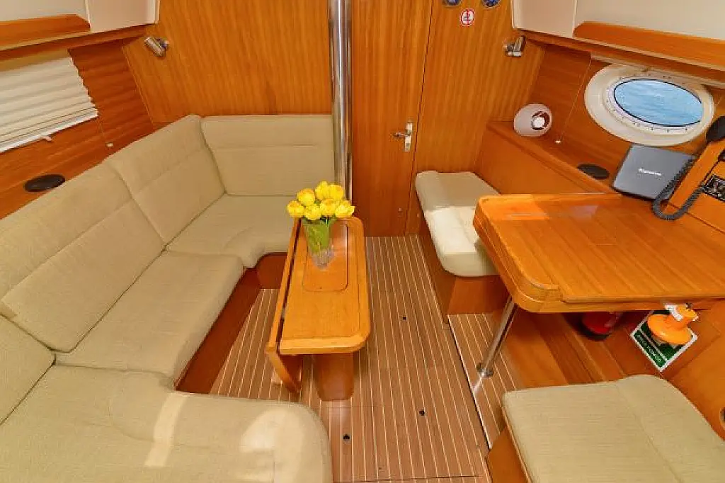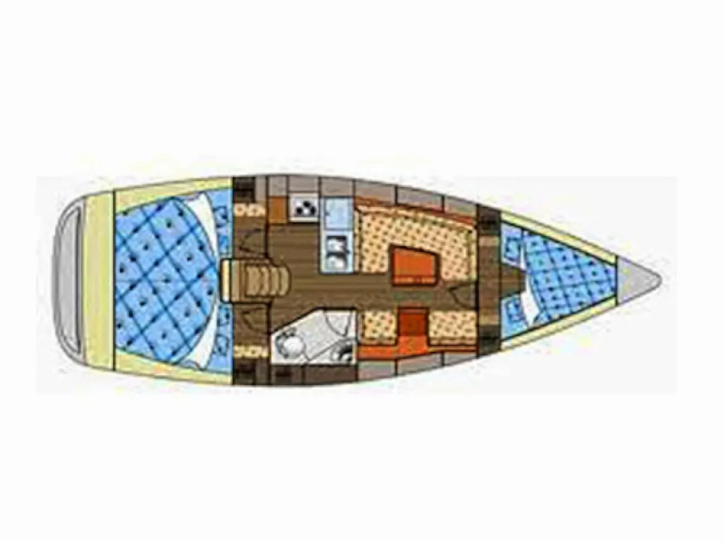 General Shipyard Elan Yachttype 344 Impression Const. Year 2006 Mooring at Marina Betina Betina (Croatia) Dimensions Length over All (LoA) 10,46 m 34,31 ft. Hull length 9,99 m 32,77 ft. Length above Waterline (LWL) 8,79 m 28,83 ft. Width over All (WoA) 3,49 m 11,45 ft. Draft max. 1,60 m 5,25 ft. Displacement 6000 kg 13200 lbs Volumes Water 1 Tank, 238 ltr. Hot Water 1 Boiler, 80 ltr. Faeces 1 Tank, 80 ltr. Fuel 1 Tank, 110 ltr. Enginevalues Motortype Diesel Engine Manufacturer Volvo Engine Type Penta-VO34X Power kW / HP 21 / 29 Cylinders 4 Propeller data Number Propeller 1 Propeller blades 2 Berth(s) / Cabin(s) Bug 2 Berth(s) / 1 Cabin(s) Salon 1 Berth(s) Aft 4 Berth(s) / 2 Cabin(s) Showers / Toilettes Showers 1 Toilettes 1 Saildata Mainsail 27,80 m² Genoa 30,25 m² Sails total 58,05 m² Navigation GPS-Plotter autopilot echolot logge lot anemometer Windex navigation equipment binoculars bearing compass VHF-Radio Sea Equipment wheelsteering rearanchor anchor w. chain electr. anchor winch w. remotecontrol batten mainsail Lazy Jack Lazy Bag reefing genoa Sprayhood Biminitop Boathook Fender Safety equipment life jacket Adult life jacket Child rescue horseshoe signal horn dinghi w. paddels toolkit Fire extinguishers Medi-Kit Boardmans chair Emergency rocket emergency tiller man. Bilgepump Comfort on deck rearshower gangway Bathing ladder Bathing platform Shore power connection Comfort under deck Stereoradio / CD-Player Speakers Salon w. Woodpaneling Salon furniture w. fabric upholstery Cabin furniture w. fabric upholstery Clock, barometer, thermometer Waterheater electr. Refrigerator Cookware Dinnerware Cutlery Gas stove w. 2 flame Stovepipe integrated in cooker Planket Pillows Socket(s) 12V / 220 V 1 toilet / shower combination Starter Battery 1 Service batterie