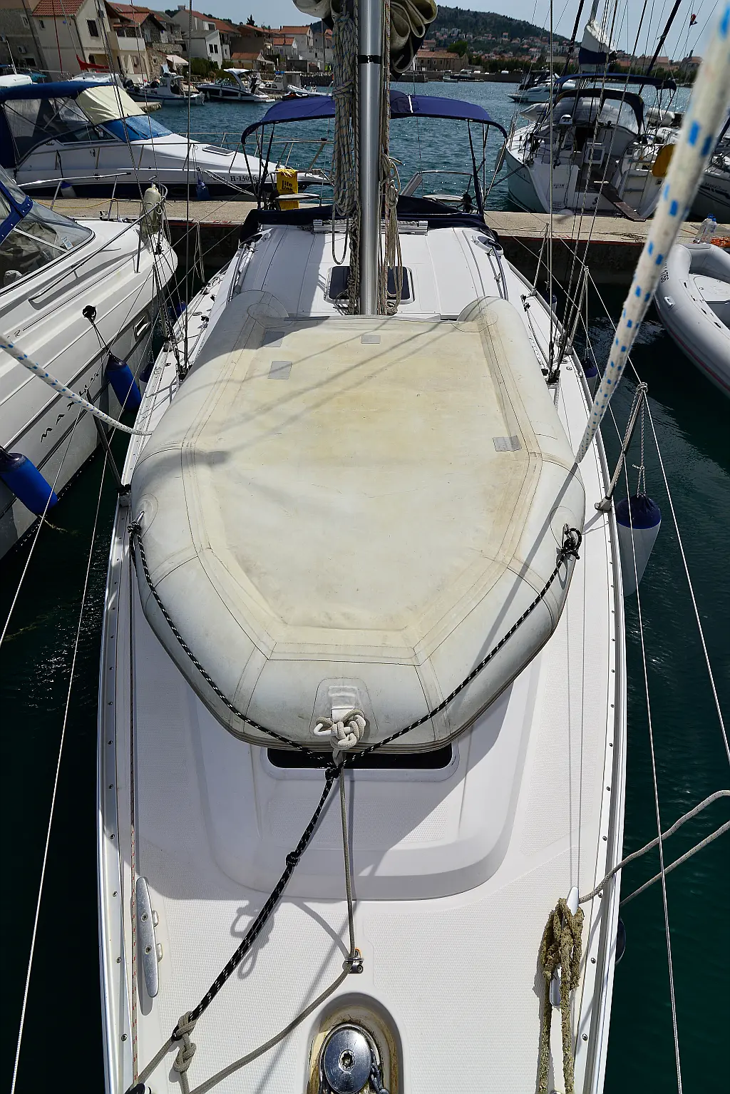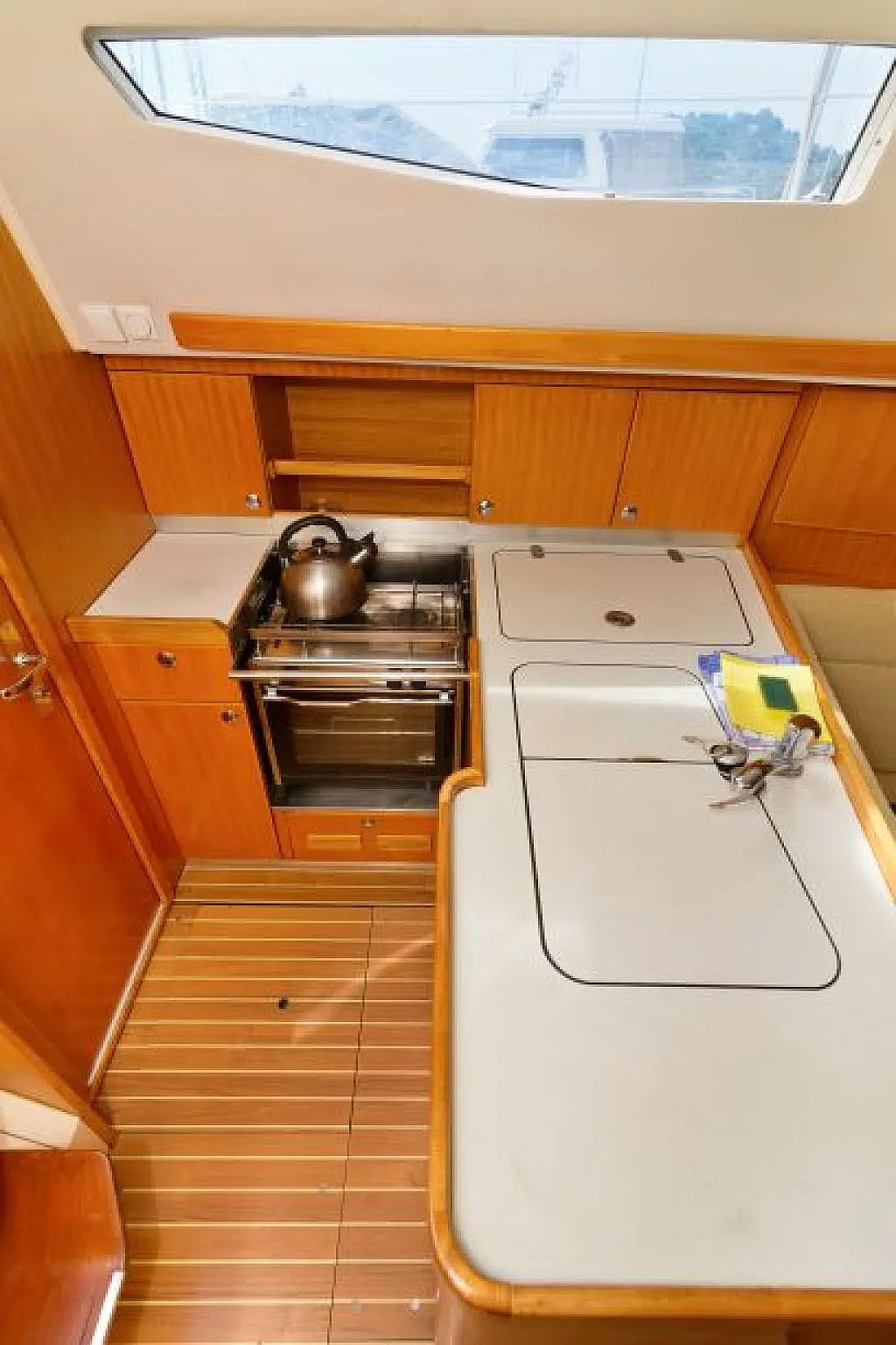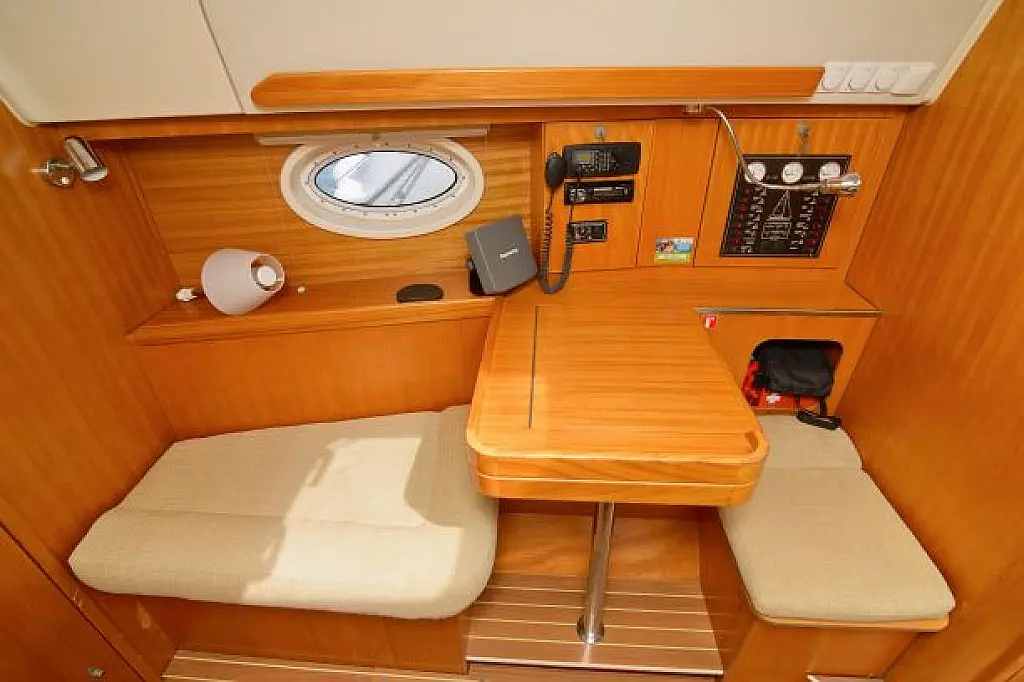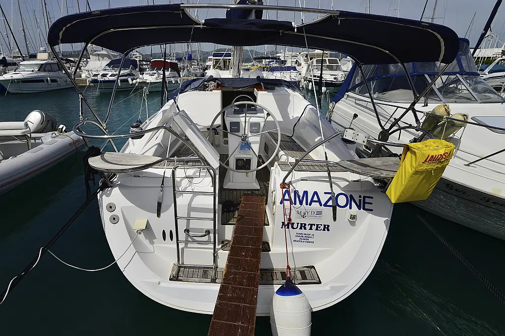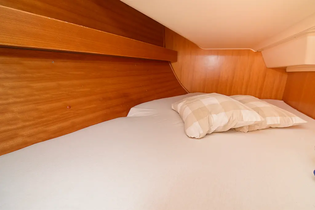 General Shipyard Elan Yachttype 344 Impression Const. Year 2006 Mooring at Marina Betina Betina (Croatia) Dimensions Length over All (LoA) 10,46 m 34,31 ft. Hull length 9,99 m 32,77 ft. Length above Waterline (LWL) 8,79 m 28,83 ft. Width over All (WoA) 3,49 m 11,45 ft. Draft max. 1,60 m 5,25 ft. Displacement 6000 kg 13200 lbs Volumes Water 1 Tank, 238 ltr. Hot Water 1 Boiler, 80 ltr. Faeces 1 Tank, 80 ltr. Fuel 1 Tank, 110 ltr. Enginevalues Motortype Diesel Engine Manufacturer Volvo Engine Type Penta-VO34X Power kW / HP 21 / 29 Cylinders 4 Propeller data Number Propeller 1 Propeller blades 2 Berth(s) / Cabin(s) Bug 2 Berth(s) / 1 Cabin(s) Salon 1 Berth(s) Aft 4 Berth(s) / 2 Cabin(s) Showers / Toilettes Showers 1 Toilettes 1 Saildata Mainsail 27,80 m² Genoa 30,25 m² Sails total 58,05 m² Navigation GPS-Plotter autopilot echolot logge lot anemometer Windex navigation equipment binoculars bearing compass VHF-Radio Sea Equipment wheelsteering rearanchor anchor w. chain electr. anchor winch w. remotecontrol batten mainsail Lazy Jack Lazy Bag reefing genoa Sprayhood Biminitop Boathook Fender Safety equipment life jacket Adult life jacket Child rescue horseshoe signal horn dinghi w. paddels toolkit Fire extinguishers Medi-Kit Boardmans chair Emergency rocket emergency tiller man. Bilgepump Comfort on deck rearshower gangway Bathing ladder Bathing platform Shore power connection Comfort under deck Stereoradio / CD-Player Speakers Salon w. Woodpaneling Salon furniture w. fabric upholstery Cabin furniture w. fabric upholstery Clock, barometer, thermometer Waterheater electr. Refrigerator Cookware Dinnerware Cutlery Gas stove w. 2 flame Stovepipe integrated in cooker Planket Pillows Socket(s) 12V / 220 V 1 toilet / shower combination Starter Battery 1 Service batterie