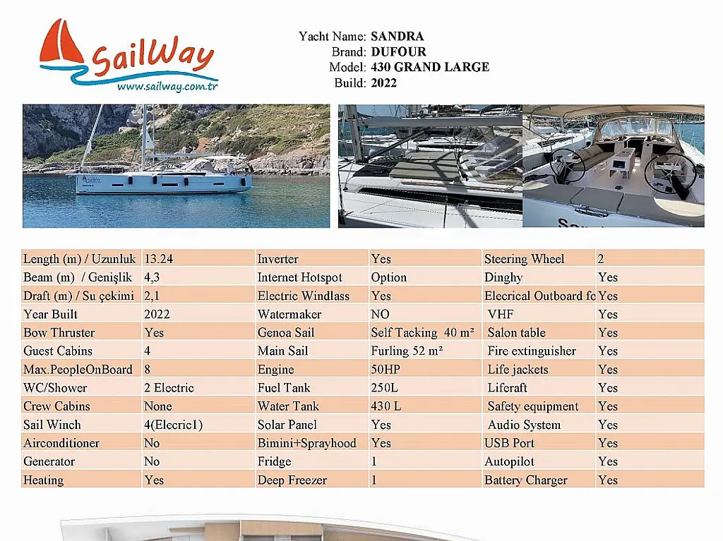 Bimini , Swimming platform , Solar Panels , Refrigerator , Dinghy , Inverter , Electric toilet , Heating , Electric winches